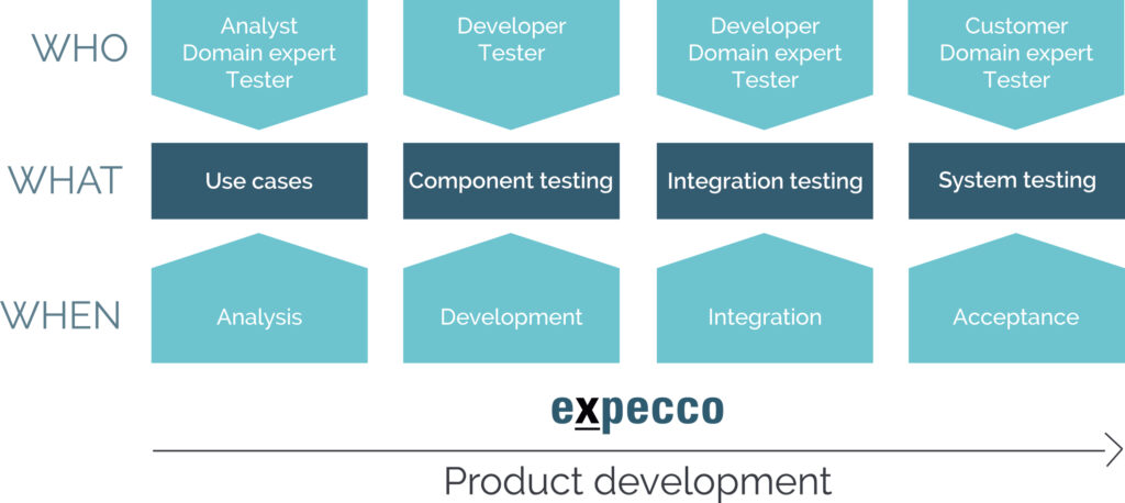 If analysts already model the product requirements in expecco, these test cases can be reused until the final system test. A major advantage is that executable tests are already available at the start of the project, which can be reused until the final system test. Every further development can be checked and documented immediately. The fact that component and system tests are no longer separated and therefore no new test cases need to be written reduces your costs considerably. Overall, everyone involved benefits from this system: optimised communication, more effective collaboration and early error detection lead to effective increases in productivity in every development phase.
